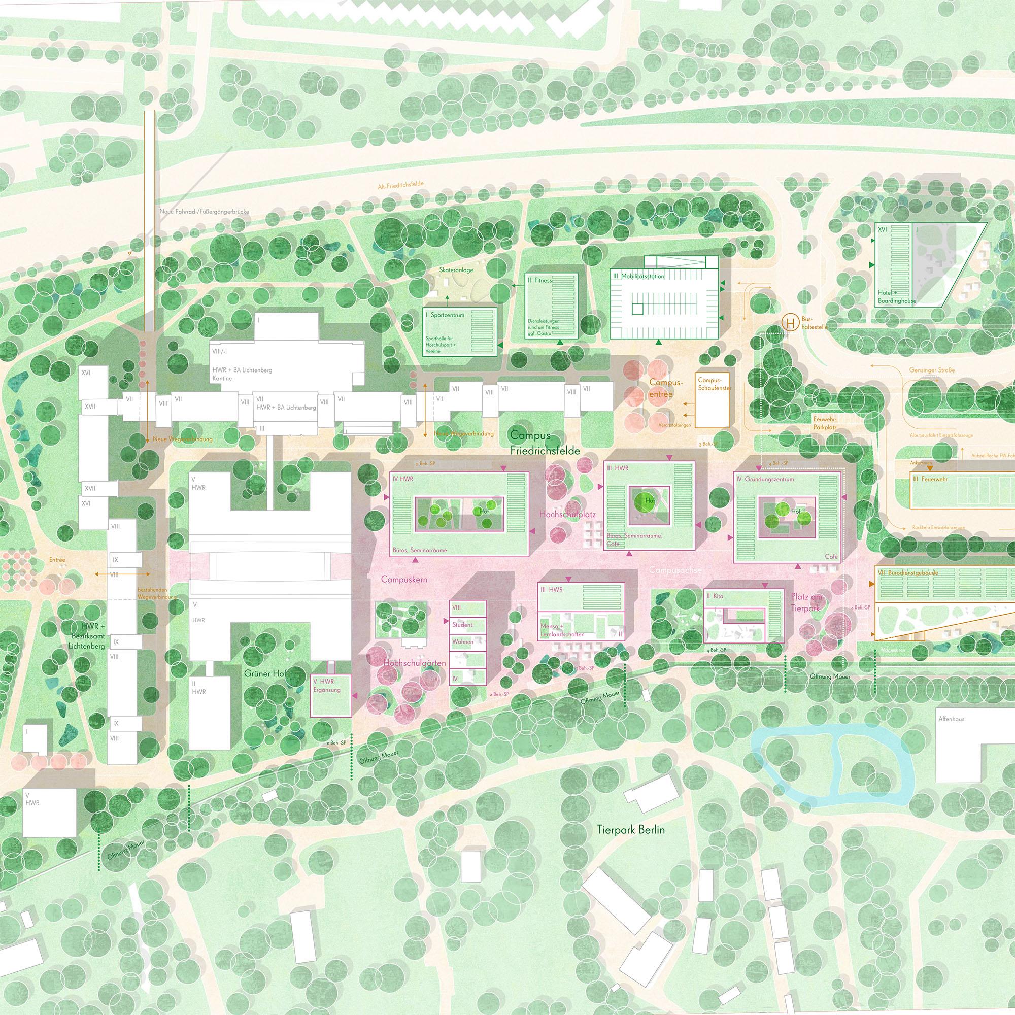 Mit der Campus-Achse und den angrenzenden Plätzen sollen die zentralen Bereiche des Campus Friedrichsfelde autofrei gestaltet und eine fußläufige Erschließung vom westlichen Campus- Eingang hergestellt werden. Auch das ringförmige Wegeband, welches den Campus umschließt, soll vorwiegend den Fußgängern und Radfahrern vorbehalten sein. Die Erschließung der erforderlichen Behindertenstellplätze an den Gebäuden bzw. der Stellplätze der Feuerwehr sowie eine Befahrbarkeit durch Anlieferverkehr, Feuerwehr- oder Müllfahrzeuge sind dabei gewährleistet.