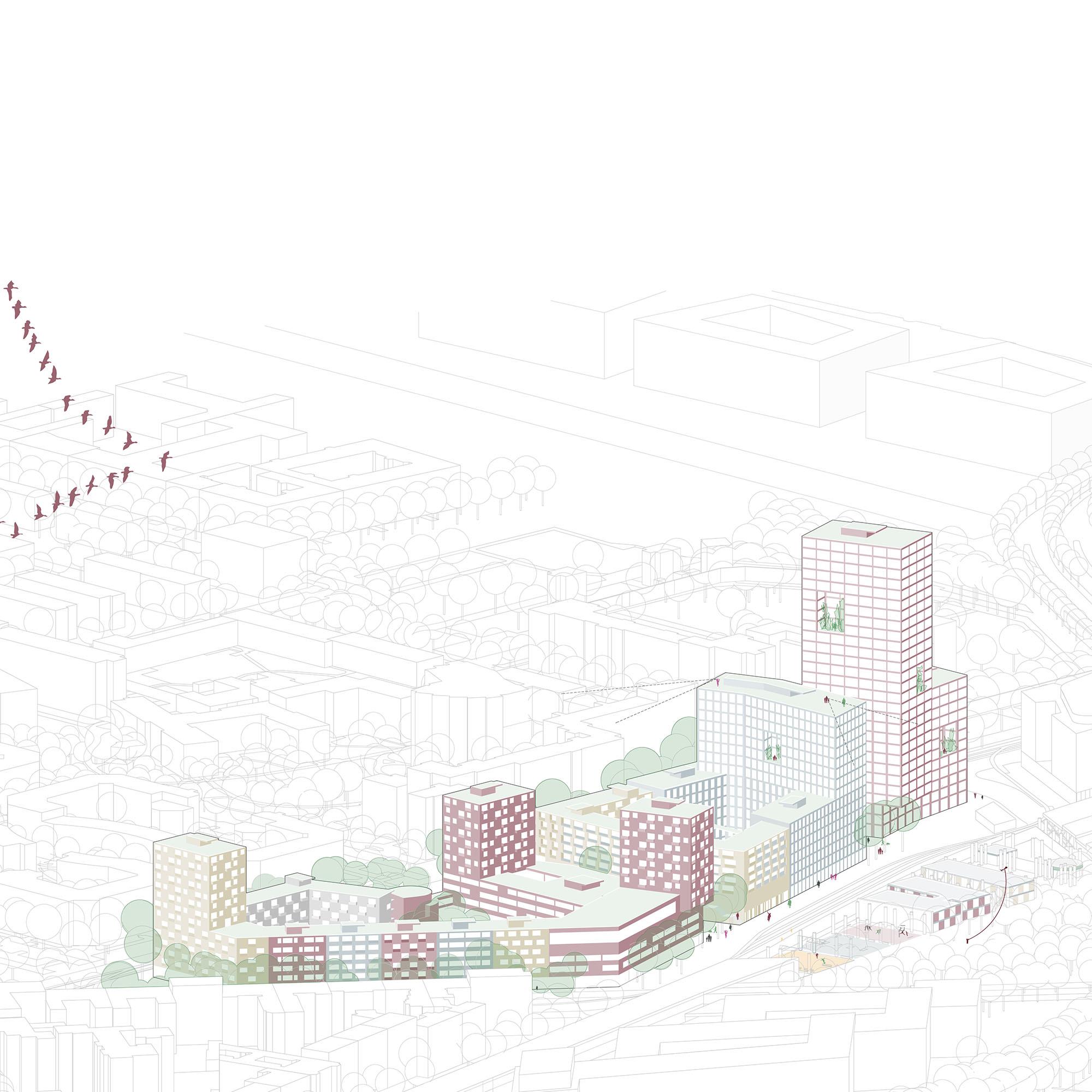 Unser Entwurf schlägt zwei großstädtische, durchmischte "Superblöcke" vor. Im Osten entsteht ein Hochpunkt-Cluster aus drei Türmen mit Fernwirkung in Richtung Stadtzentrum. Weitere im Quartier verteilte Hochpunkte sind niedriger und markieren wichtige Anknüpfungspunkte an die Umgebung.