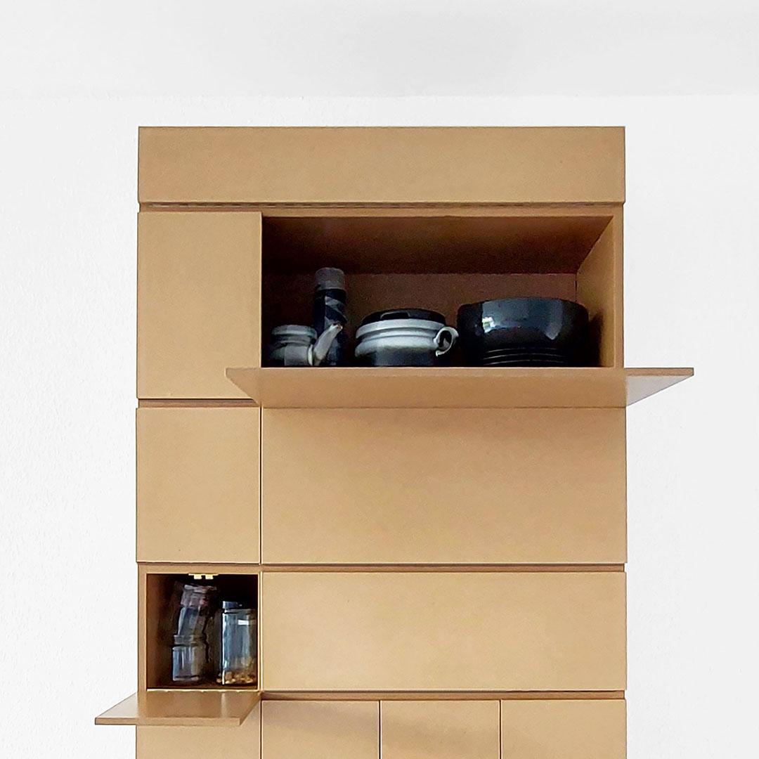 Für eine Wohnung wird neues Mobiliar geplant. Als Ausgangsmaterial für alle neuen Elemente wird formaldehydfreie mitteldichte Faserplatte (MDF) verwendet. Die geometrisch-abstrakten neuen Körper treten nicht in Konkurrenz zu den vorhandenen historischen Möbeln und sind klar als neu hinzukommende Elemente ablesbar. Für die Küche wird ein Apothekerschrank mit verschiedenen Auszügen und Klappen und einem Flaschenregal im unteren Bereich entwickelt. Das Wohnzimmer erhält eine würfelförmige Medienbox, die u.a. Drucker, Scanner und weitere Geräte enthält. Alle Elemente der Möbelserie werden grifflos und ohne sichtbare Verbindungsmittel ausgeführt.