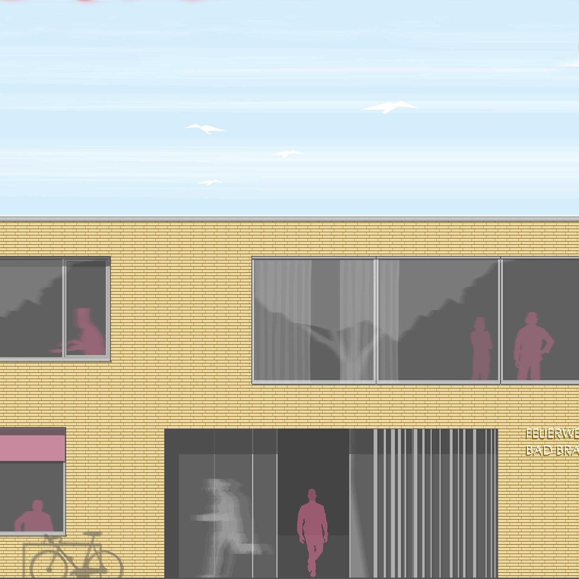 Für das Gebäude sollen robuste und ortsübliche Materialien zum Einsatz kommen. Das Gebäude wird in massiver Bauweise mit Klinker-/Ziegel-Vorsatzschale als Fassade errichtet. Durch die massive Bauweise verfügt das Gebäude über eine hohe thermische Speicherfähigkeit. Wir schlagen einen dänischen Wasserstrichziegel in gelb, geflammt für die Außenfassade vor. Dieses Material nimmt Bezug auf die südlich angrenzende Wohnbebauung. So wird sowohl eine Einbindung in den örtlichen Kontext erreicht, zudem versprechen die Materialien eine hohe Dauerhaftigkeit.